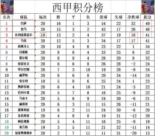 积分榜方面,巴萨11连胜被终止后,下半程刚开始,他们就被皇马将分差缩小到了1分,两队的争冠悬念还是很大。比利亚雷亚尔本轮输球,无力再往前追皇马,而且今天马竞今天赢球后追了上来,比利亚雷亚尔仅凭1个净胜球守住第3。