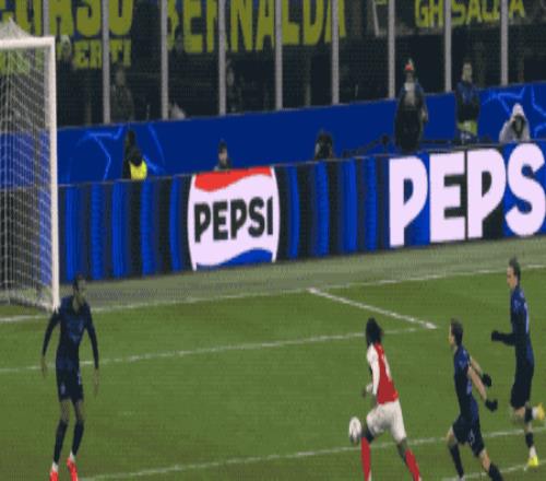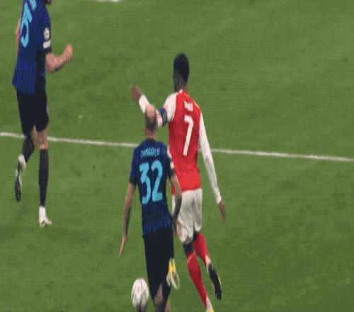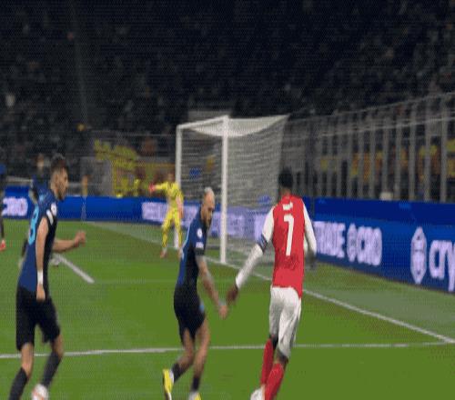 比分再次落后的国米准备大举压上,阿森纳顺势打出快速反击,萨卡一路盘带到了禁区前,选择兜射远角,但皮球没能命中目标。